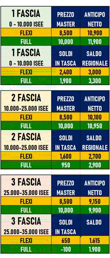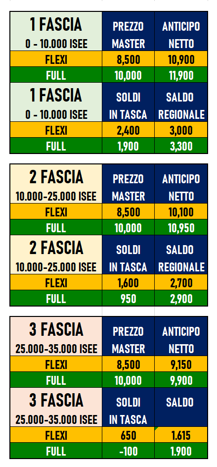 Per es. se un corsista di 2 fascia ha ricevuto sul suo conto corrente € 10.950, subito dopo che ha pagato il prezzo del Master (FULL: € 10.000), gli rimangono sul conto € 950 da spendere liberamente per le spese.